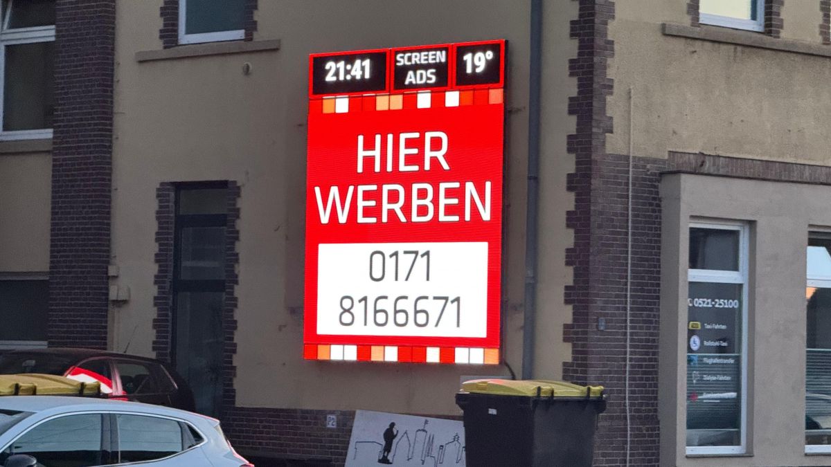Dank der Position in einem belebten Stadtbereich mit wichtigen Verkehrsknotenpunkten, eignet sich der Standort an der Detmolder Straße perfekt, um eine breite Zielgruppe zu erreichen. Die moderne LED-Werbeanlage befindet sich an der Fassade eines Privathauses direkt zwischen einem Autohaus und einem Motel.