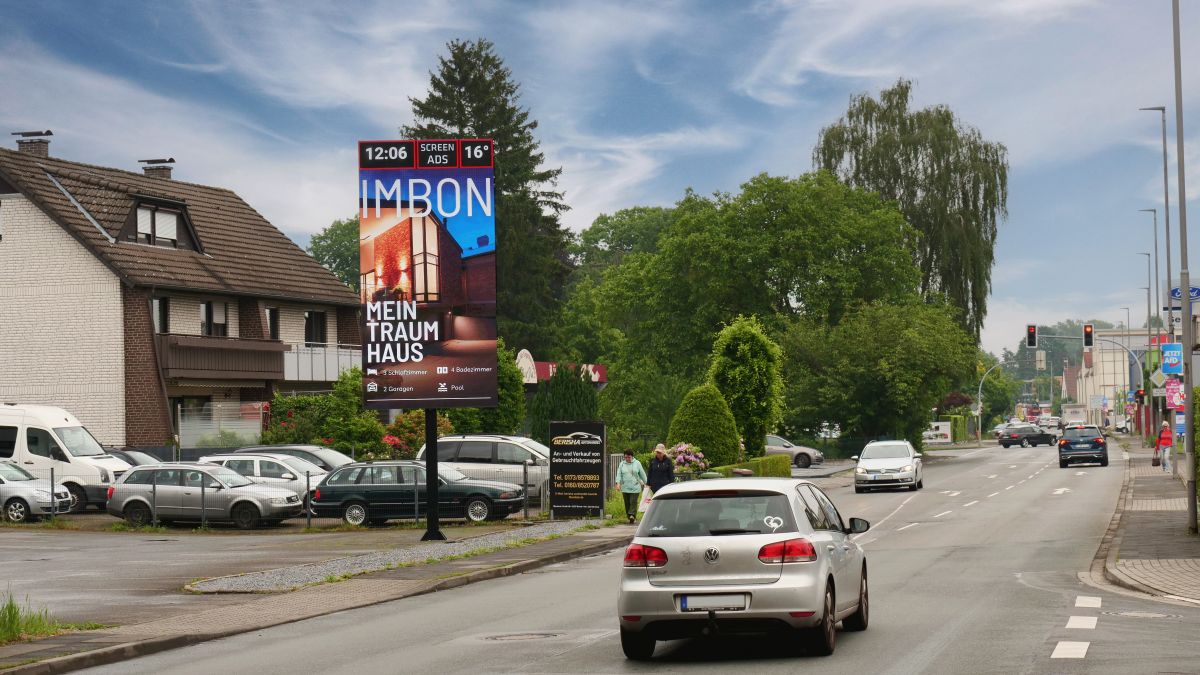 Die LED-Anlage befindet sich an einer stark frequentierten Straße. Auf der Verbindungsstraße nach Hiddenhausen und Herford fahren die Autos langsam auf eine Ampelkreuzung zu, was einen ruhigen und langen Blick auf den Screen ermöglicht. Durch die klare Sicht auf den Screen fällt Werbung bereits aus größerer Entfernung ins Auge. Zudem sorgt die innerstädtische Geschwindigkeitsbegrenzung dafür, dass Verkehrsteilnehmer ausreichend Zeit haben, die Inhalte bewusst wahrzunehmen. In direkter Umgebung befinden sich Geschäfte, Gastronomie und Wohngebiete – ideale Voraussetzungen, um ein breites Publikum zu erreichen.