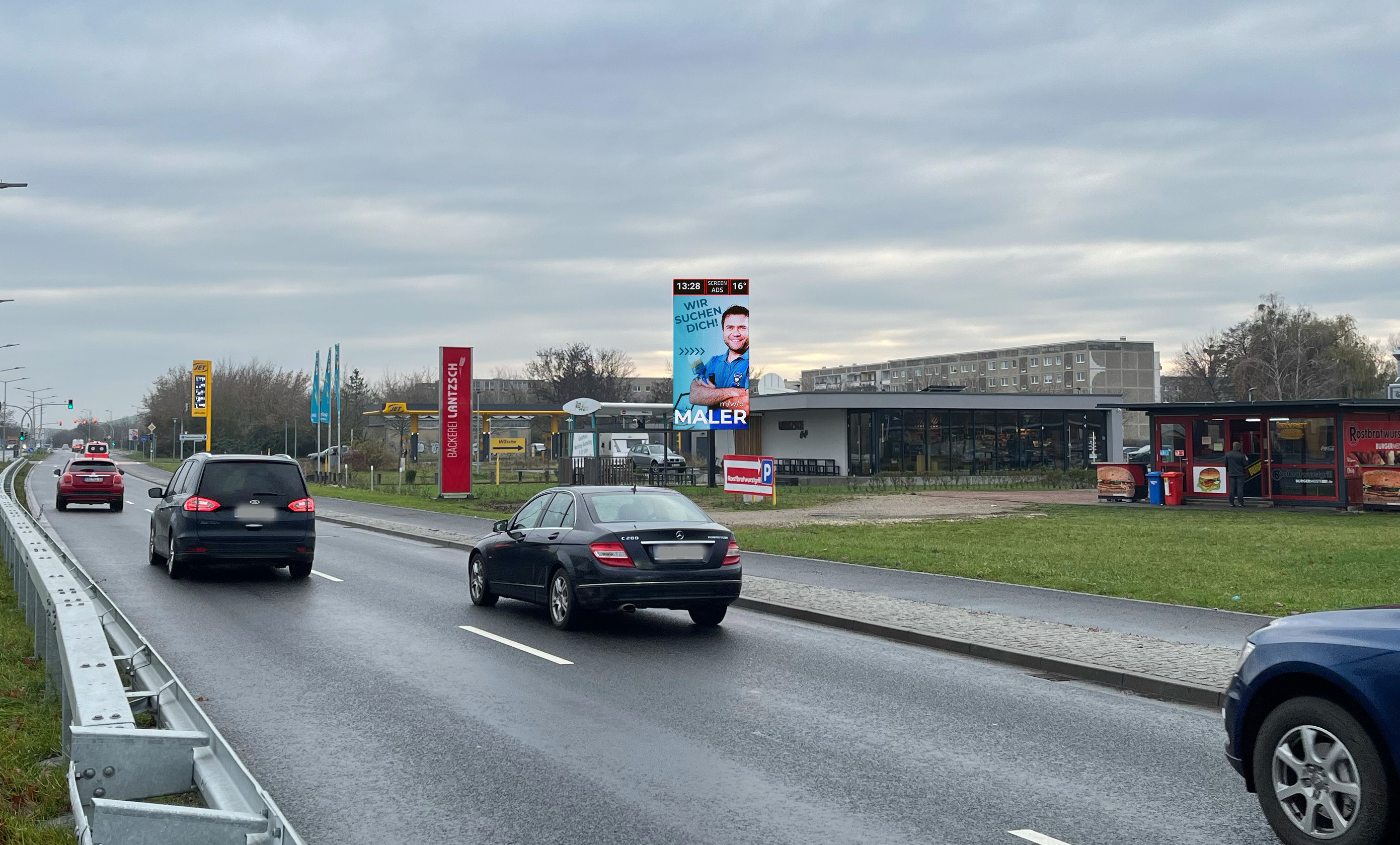 Direkt an der B184 gelegen, fängt die LED- Werbeanlage die Blicke der Autofahrer ein, die von Norden aus nach Dessau einfahren. Durch die leichte Linksbiegung der Einfallstraße, ist die Sicht auf den Screen schon von weither möglich. Die Geschwindigkeit der Autos wird kurz vorm Standort der modernen Werbeanlage auf 50 km/h gedrosselt, sodass eine Betrachtung der Werbespots gefahrlos möglich ist.